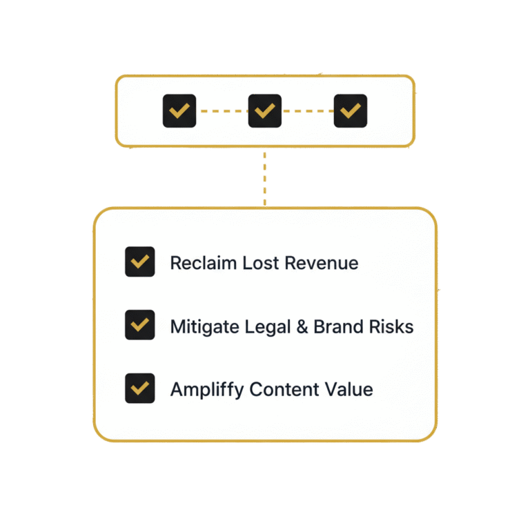 Chúng tôi chủ động truy thu và đảm bảo hoàn trả doanh thu từ các trường hợp vi phạm được xác định. Quá trình này giảm thiểu trực tiếp tổn thất tài chính và hạn chế rủi ro ảnh hưởng đến thương hiệu. Bạn sẽ kiểm soát nội dung của mình và tối ưu hóa giá trị kinh tế từ nó.