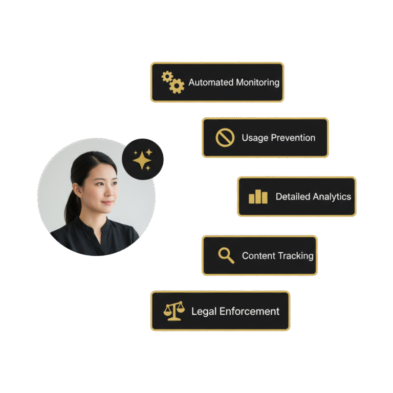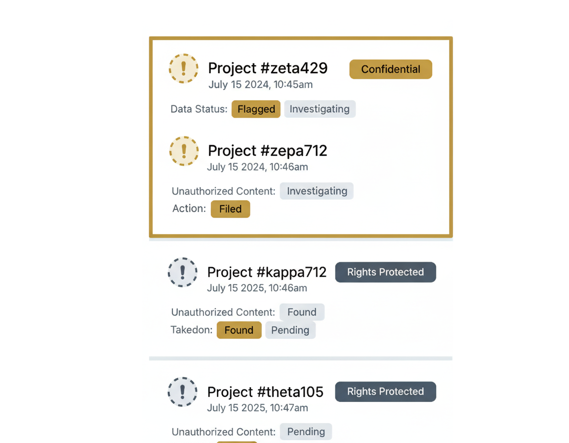 Ngay khi phát hiện hành vi sử dụng trái phép, chúng tôi hành động tức thì để bảo vệ quyền lợi của bạn — thực hiện khiếu nại, gửi yêu cầu gỡ bỏ trên nhiều nền tảng nhằm ngăn chặn vi phạm và khôi phục quyền kiểm soát nội dung của bạn.