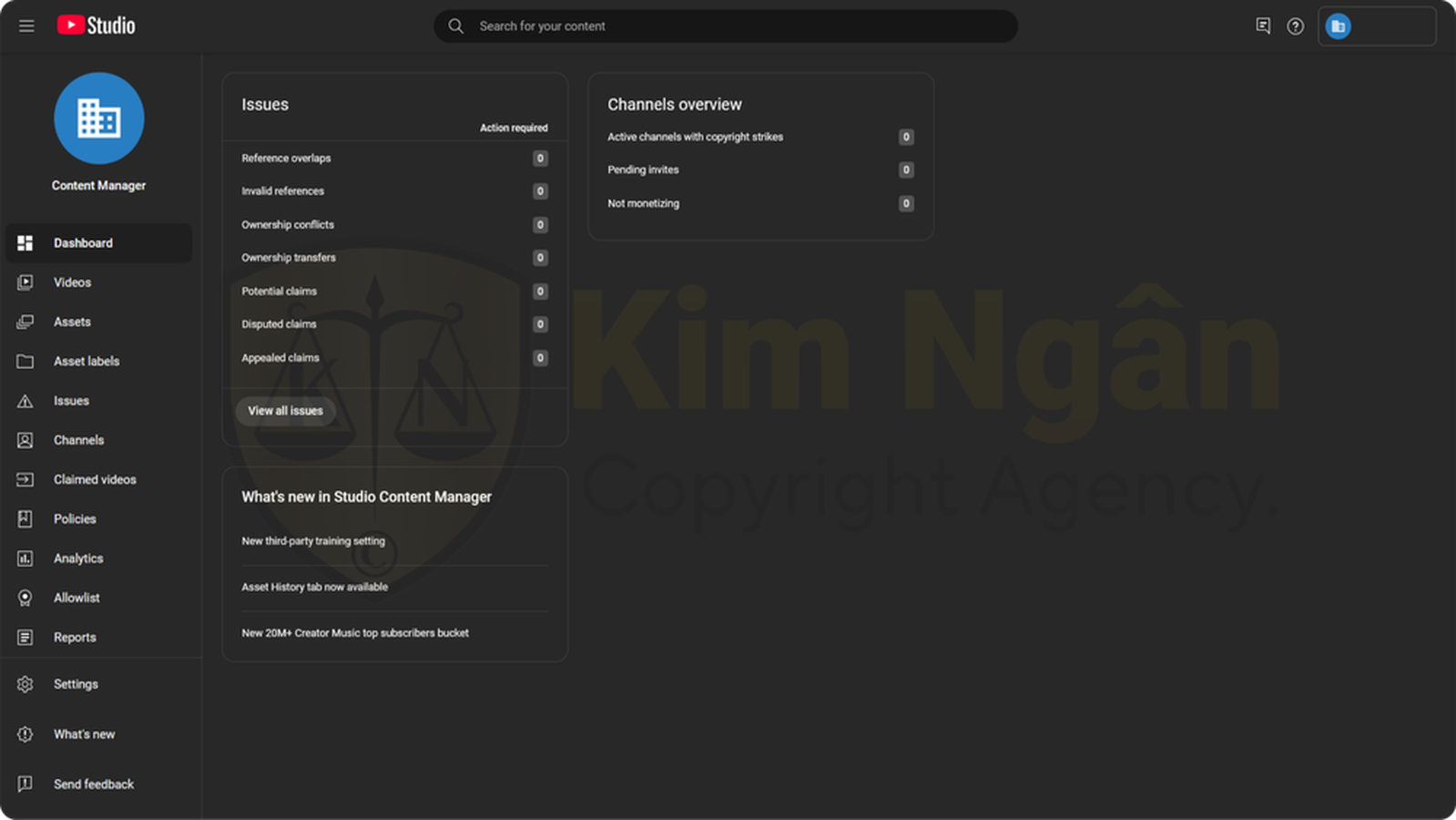 Chúng tôi là Kim Ngân Copyright Agency – tổ chức đại diện bản quyền uy tín, hoạt động chuyên sâu trong lĩnh vực bảo vệ, quản lý và thực thi quyền tác giả, quyền liên quan cho các nhà sáng tạo, nhạc sĩ, nghệ sĩ, hãng sản xuất và doanh nghiệp truyền thông. Với hệ thống công cụ bản quyền tiên tiến như YouTube Content ID, CMS quản lý nội dung, và các nền tảng nhận diện quyền sở hữu toàn cầu, chúng tôi giúp đỡ tác phẩm kiểm soát, bảo vệ và quản lý toàn diện mọi tác phẩm âm nhạc, video, giai điệu trên mọi trường số.